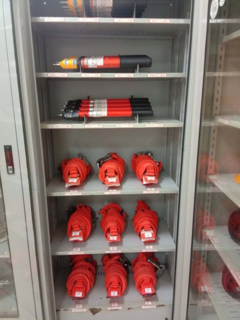 如上圖,安全工具柜共分為5個橫隔層,其中上面兩層存儲個人保安線,中間有個豎隔層。下面兩層是用于存放腳扣所用。中間一層本為自由使用,現(xiàn)也根據(jù)實際需求用于存儲個人保安線。細心的人可以看到在安全工器具前面都貼有標簽,包含產(chǎn)品的名稱、編號、數(shù)量等。
