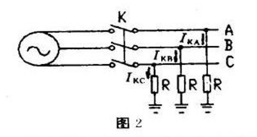 如圖2所示。在這種接法下,假如開關(guān)K誤投入,三相短路電流IKA、IKB、IKC將分別從各相接地線流入大地后成閉合回路。短路電流流經(jīng)接地電阻R時(shí),將在其上產(chǎn)生一個(gè)壓降: