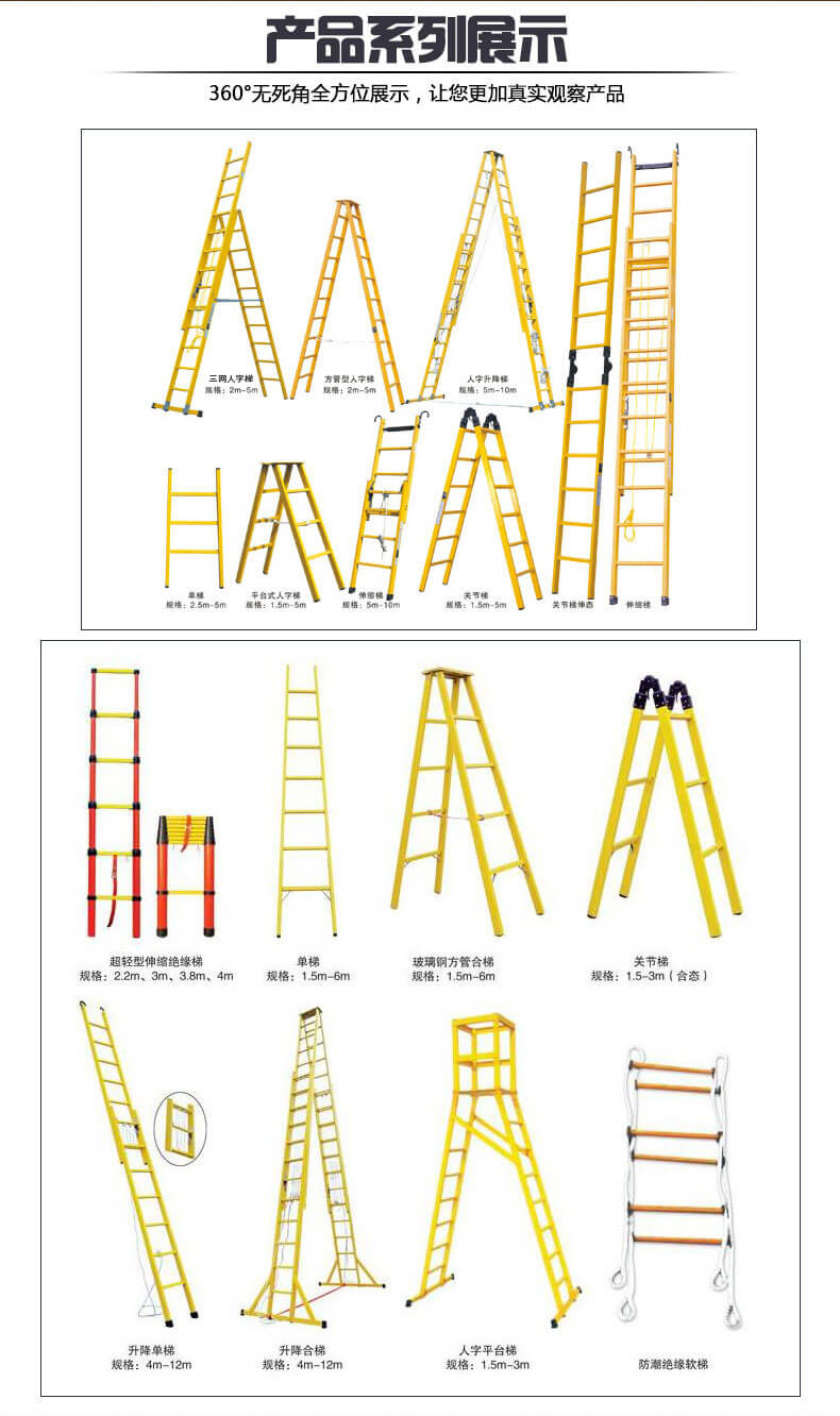 分類絕緣梯分為絕緣單梯,絕緣軟梯,絕緣竹節(jié)梯(魚竿梯),絕緣關(guān)節(jié)梯,絕緣單直梯,絕緣合梯,絕緣人字梯,絕緣升降梯(絕緣人字單升降梯,絕緣伸縮合梯,絕緣伸縮人字梯),絕緣凳,絕緣踏步凳,絕緣高低凳,絕緣高凳,絕緣升降平臺(tái),全絕緣腳手架等 。